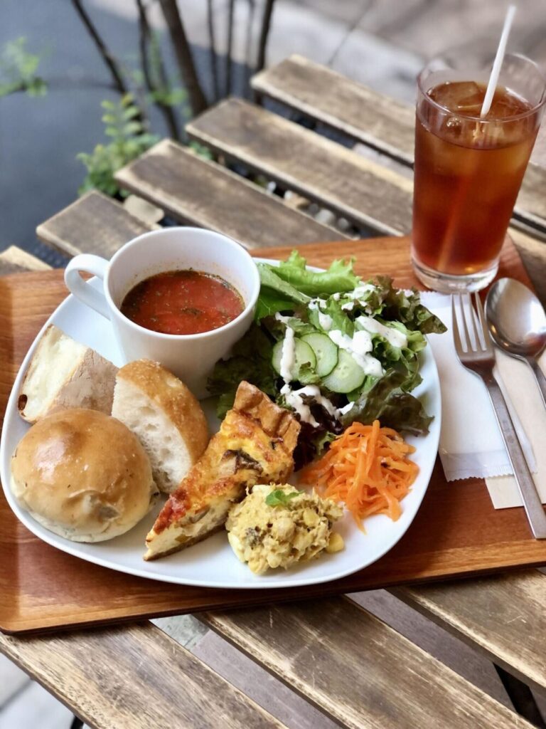 - ランチプレート(¥1,150) → 自家製パンの盛り合わせ、キッシュ、惣菜、スープ、サラダ、ドリンク付き 。野菜たっぷりで授乳中ママの体にも優しい!