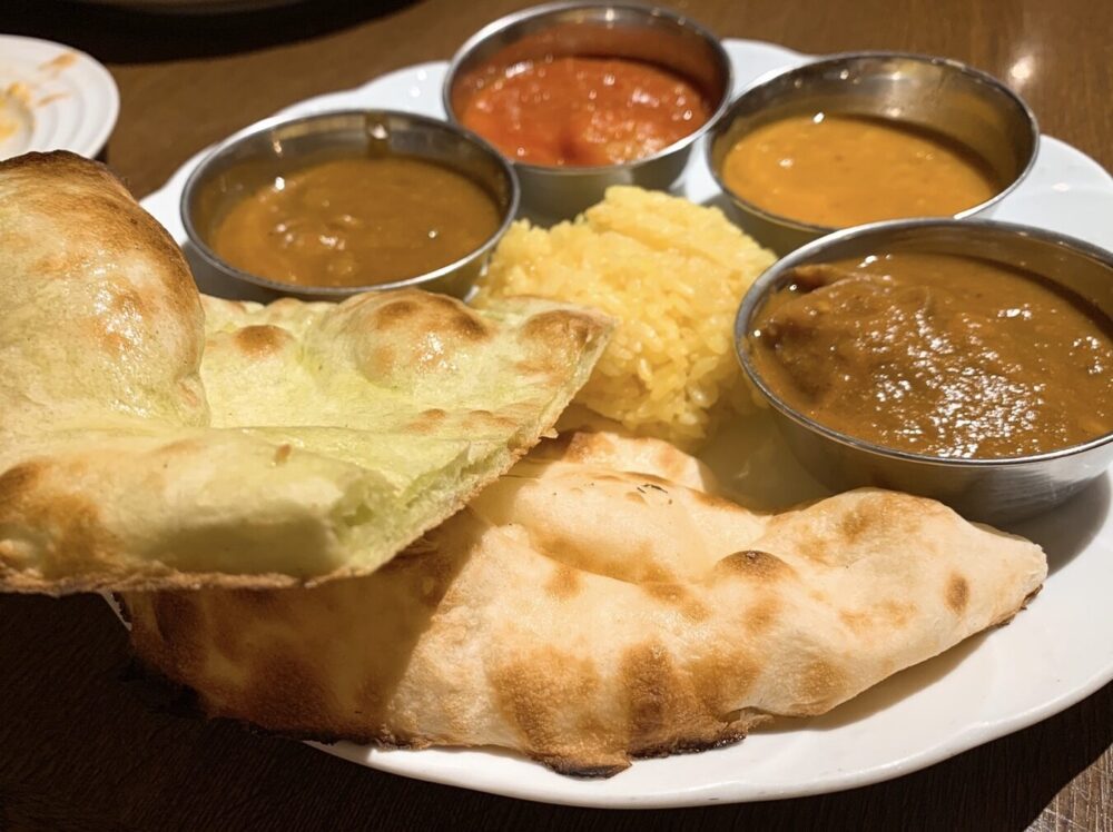 - ランチビュッフェ(平日)(大人1,390円・子供690円・2歳以下無料) → 4種の日替わりカレー+ナン2種+ターメリックライス・サラダ・ドリンク付き。3〜9歳は¥690、2歳以下無料 という太っ腹さが最高!