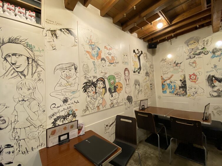 壁一面に漫画家さんのイラストで埋め尽くされているのが特徴のカフェレストランで、子どもが好きなキャラクターがいると喜んでくれそう。ソファー席があってゆったり座れるのも子連れには嬉しい。ベビーカー入店OK、お子様メニューあり、漫画(2000冊)、ソファー席完備という充実ぶり。ただし詳細な席数・営業時間は来店前に要確認を!